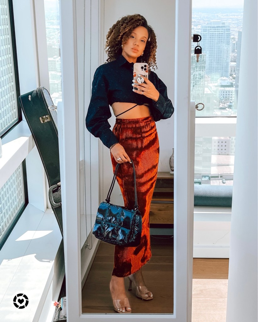 The shirt is from Matthew Bunch, just a cropped Button, and the skirt is from Ronny Kobo, Jay Velvet Midi Skirt. You can shop my whole outfit on my Like2knowit. Shoes and purse also linked!