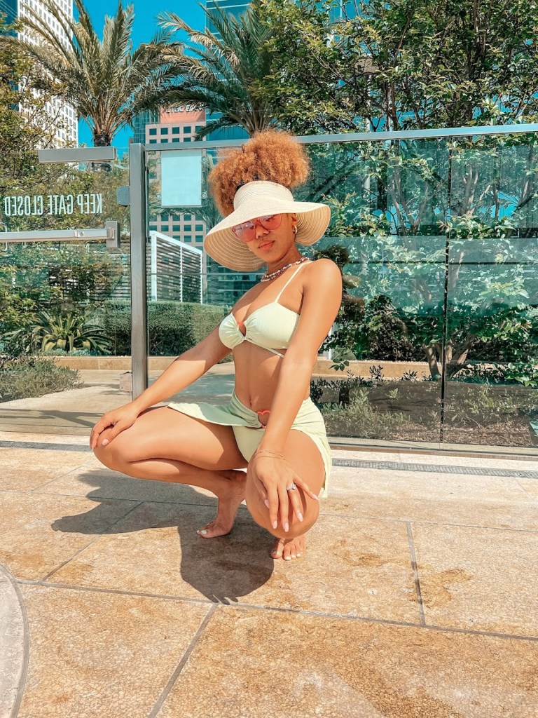 Lately I’ve been really into bright colors and fun shapes. When I saw this three piece bathing suit from SHEIN I was OBSESSED and ordered immediately. I love the colorful necklace that I can just stack with others, and I was obsessed with the pink frames. I’m very hype about this whole look!